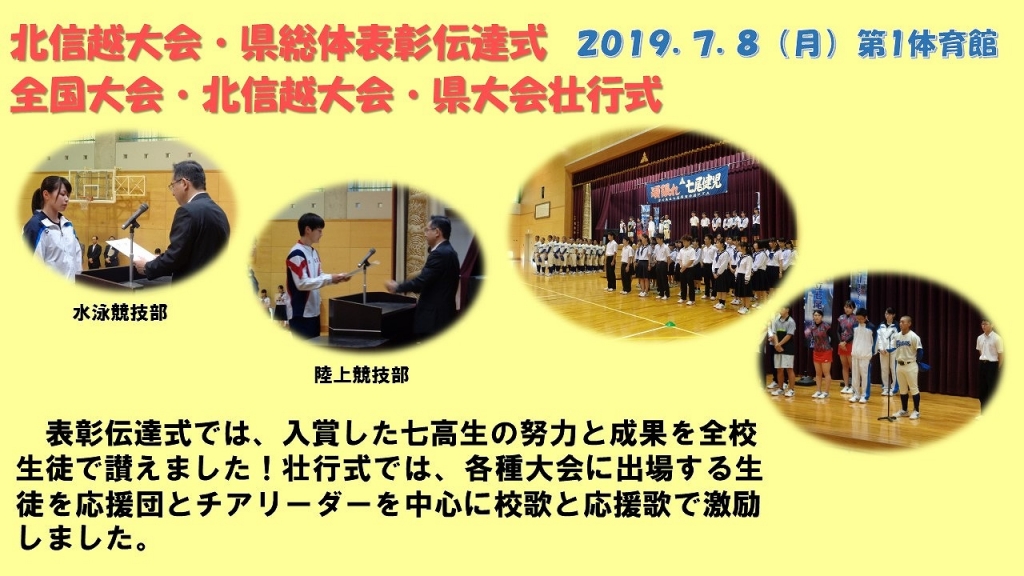 総体・総文表彰伝達式では、入賞した七高生の努力と成果を全校生徒で讃えました!北信越大会壮行式では、北信越大会に出場する生徒を応援団とチアリーダーを中心に校歌と応援歌で激励しました。