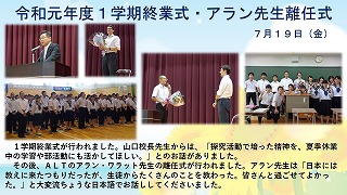終業式が行われました。感染症拡大防止のため、各教室で校内放送による実施となりました。山口和人学校長からは、コロナ禍という困難に挫けず、強い意志をもって自己の成長に努めてほしいという思いを込め、「疾風にして勁草を知る」という言葉が贈られました。その後、教務課からは学習について、生徒課からは夏休みの生活についてお話があり、保健課からは、引き続き、行動記録を残しておくように、とのお話がありました。生徒たちは熱心にメモを取りながら話を聞いていました。