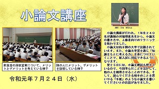 小論文講座が行われ、講師の河端理恵先生から、小論文のねらいや説得力のある自分の意見の書き方を教わりました。小論文は約8割の大学で出題されています。また、小論文学習を通じ「知識をもとに考え、表現する力」を身につけていくことで、新入試に対応できるようになります。