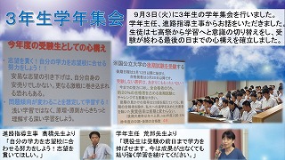 学校長、学年主任、進路指導主事からお話をいただきました。生徒は受験勉強に取り組む上での精神面や勉強面で今後必要になることを確認し、各自の進路実現に向けて決意を新たにしました。
