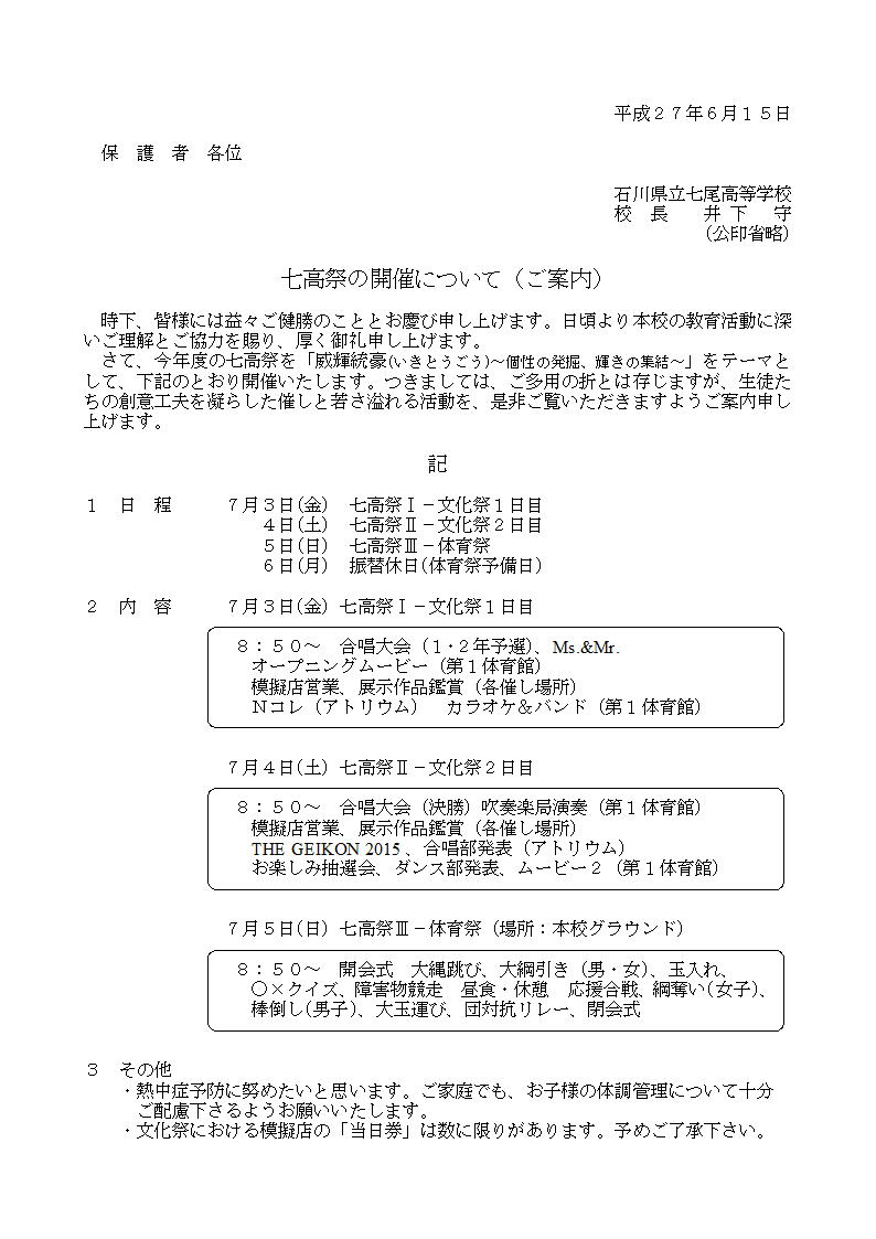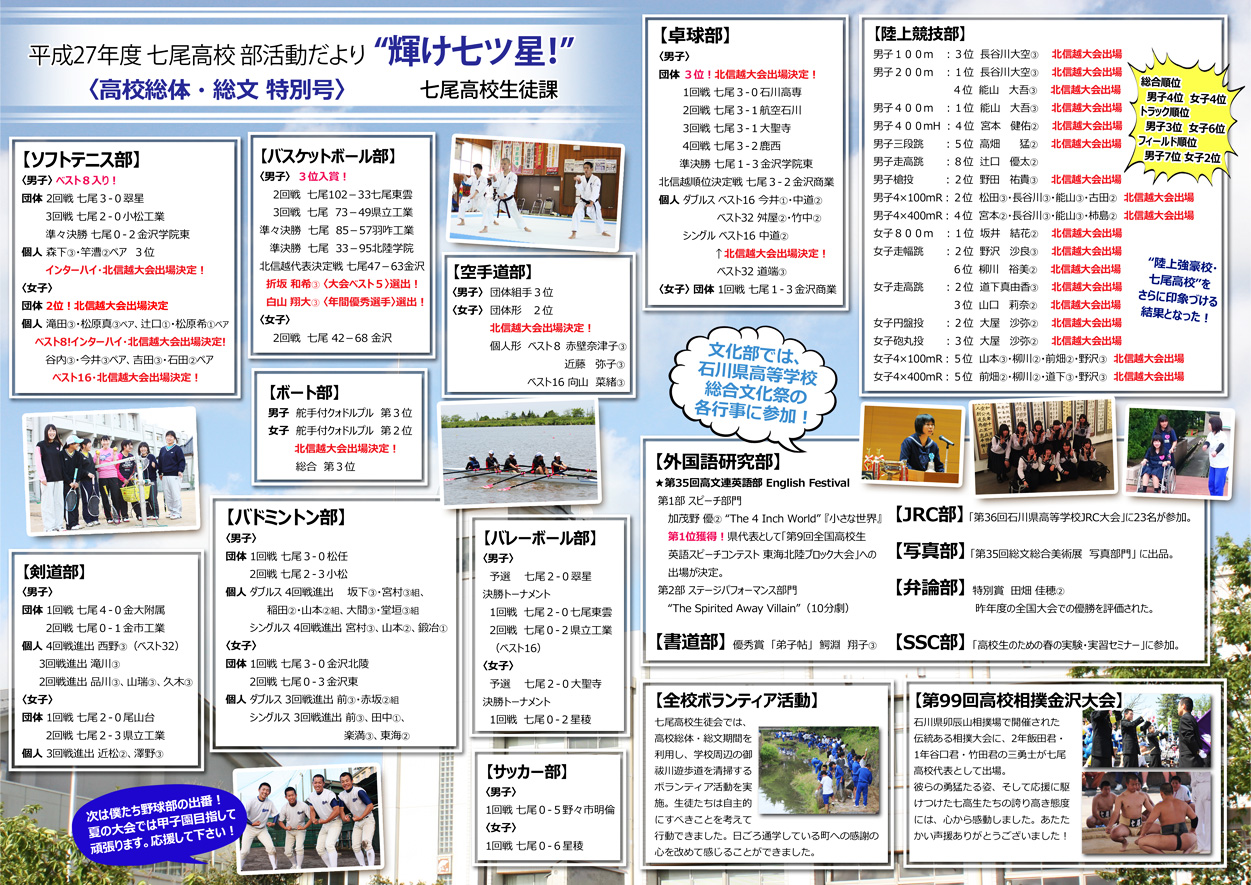 今後とも、七尾高校の教育活動にご理解とご協力をお願いいたします。