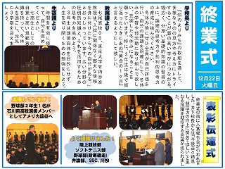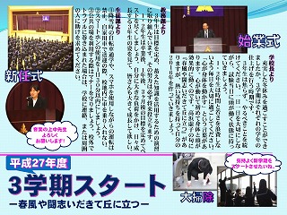 3月24日(火)に終業式が行われました。学校長からは、得意なことを伸ばし、自己実現をするために、まずは1年間を振り返って反省をし、そして行動に移してほしいと、次年度に向けた励ましの言葉がありました。