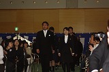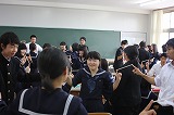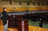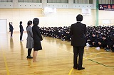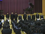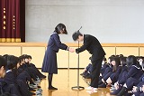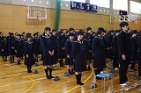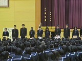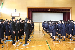握手を交わす代表 2・3年生の校歌に聴き入る1年生