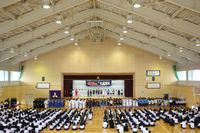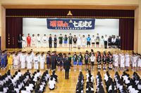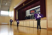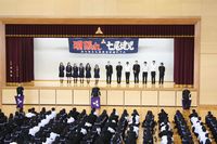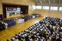 本日、総体・総文のための壮行式が行われ、ユニフォーム姿の生徒たちが体育館に並びました。各部の主将が壇上に立ち、抱負や決意を述べました。福島学校長からは、「自分に負けない戦い方を残してほしい」と激励しました。