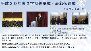 終業式・表彰伝達式 投稿日時 : 2018/12/21 nanafh 本日2学期の終業式を行いました。校長先生は今年の漢字「災」を取り上げ、「災いの多い一年であったが、皆さんには災い“わざわい”を幸い“さいわい”に変えるリーダーになってほしい。」とお話されました。併せて表彰伝達式を行い、優秀な成績をあげた生徒を全校生徒で讃えました。明日から冬休みです。計画的に過ごし、新年が有意義な一年になるようにしましょう。詳しくはこちらをクリックしてください! Tweet