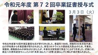 令和元年度第72回卒業証書授与式が挙行されました。普通科198名、理数科40名の各代表に山口学校長から卒業証書が授与されました。新型コロナウイルス感染拡大防止のため、卒業生、保護者、教職員のみの参加となりましたが、卒業生は皆笑顔で旅立つことができました。式後には、創立120周年記念モニュメントの「未来(あした)への響」を誇らしげに鳴らす姿が見られました。