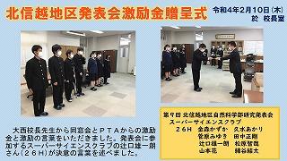北信越地区発表会激励金贈呈式 投稿日時 : 2022/02/15 nanafh 大西校長先生から同窓会とPTAからの激励金と激励の言葉をいただきました。発表会に参加するスーパーサイエンスクラブの辻口雄一朗さん(26H)が決意の言葉を述べました。 詳しくはこちらをご覧ください。 Tweet