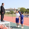 代表者が力強く選手宣誓!生徒ひとりひとりが自分の記録を塗り替えるため、走り、投げ、跳びます。