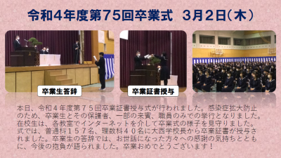 本日、令和4年度第75回卒業証書授与式が行われました。感染症拡大防止のため、卒業生とその保護者、一部の来賓、職員のみでの挙行となりました。在校生は、各教室でインターネットを介して卒業式の様子を見守りました。式では、普通科157名、理数科40名に大西学校長から卒業証書が授与されました。卒業生の答辞では、お世話になった方々への感謝の気持ちとともに、今後の抱負が語られました。卒業おめでとうございます!