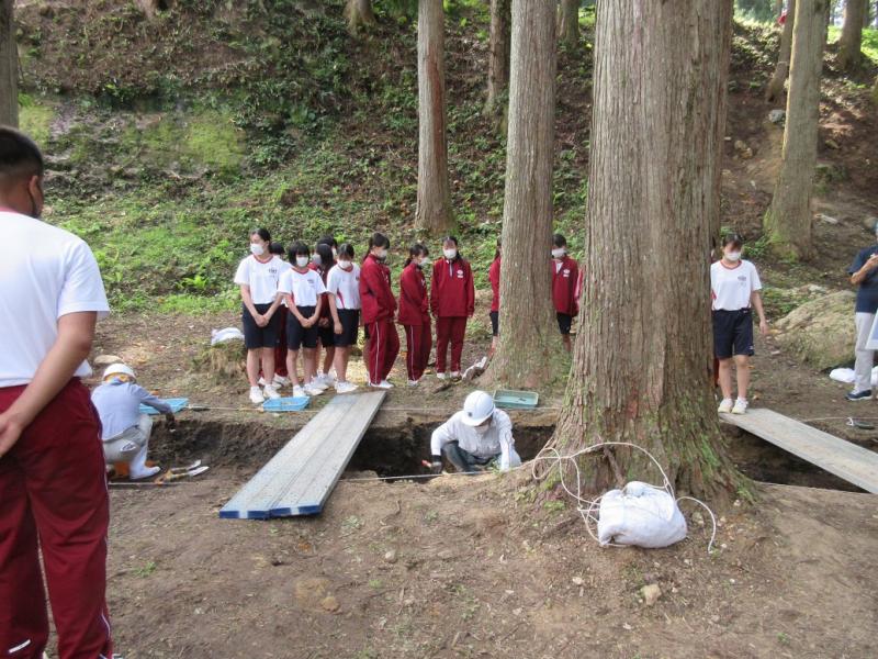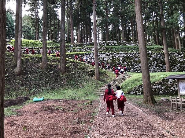 修学旅行の代わりとして七尾城跡へ遠足に行きました。現地では発掘作業の話も聞き、当時の生活のようすを知ることができました。自然や友だちと楽しく触れ合う1日になりました。