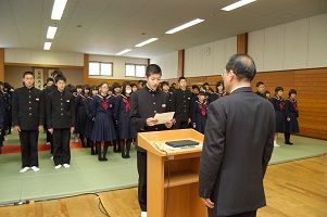 教頭先生より前期生徒会役員の任命証を受け取りました。重責ですが、よりよい七尾東部中学校を目指して頑張ってください。