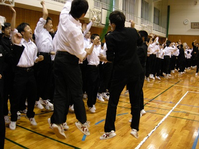 七尾鹿島陸上競技大会の壮行式の様子。校長先生からの激励に続き、応援団による激励がありました。明日はベストを尽くして頑張れ。応援も頑張ります。