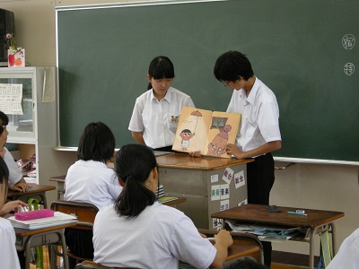 朝、全学級で図書委員による読み聞かせがありました。本の内容がわかるように
