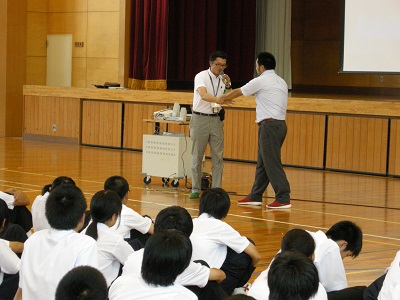 七尾警察署から職員の方をお招きして防犯教室がありました。不審者対応を中心として護身術の映像も視聴しました。本校の最も不審者役にふさわしい?先生が相手役となり、実践的な護身術の紹介をしていただきました。護身術は最後の手段であるということを強調されていました。