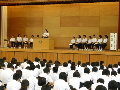 14日から始まるブロック大会の壮行式が行われました。校長先生の激励の言葉、各部キャプテンの宣誓、応援団による激励がありました。「勝者は必ず努力している」の言葉もあります。自信を持って頑張れ。