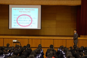 1限目に「生活オリエンテーション」が行われました。生活面、学習面、カウンセリングについてお話をしていただきました。1,2学期の反省をふまえ、3学期をどう過ごせばいいかの指針が示されました。自慢できる学校を目指して頑張っていきましょう。