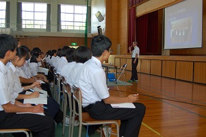 近隣の高校の先生方をお招きして、全学年と保護者を対象に高校説明会が行われています。特に3年生は進路選択に役立てるために、真剣に聞いていました。