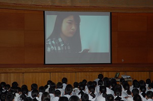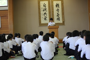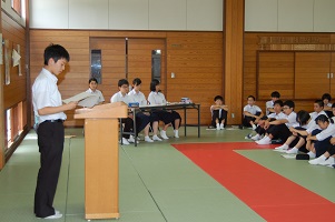 私の主張大会学年予選1年生の部が行われました。緊張の面持ちの生徒もいましたが、クラスの代表として立派に自分の主張したいことを発表することができました。今回は聞く側だった生徒たちも、無言のコミュニケーション(うなずきや目線)を意識することができていました。