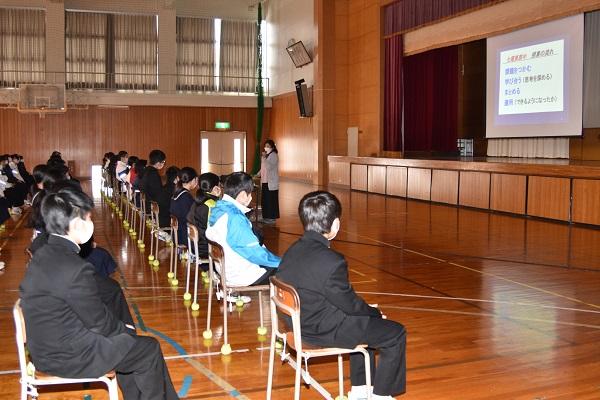 1,2年生が学習面と生活面について話を聞きました。新学年になるにあたり、自分のするべき行動を見つめ直す良い機会となりました。