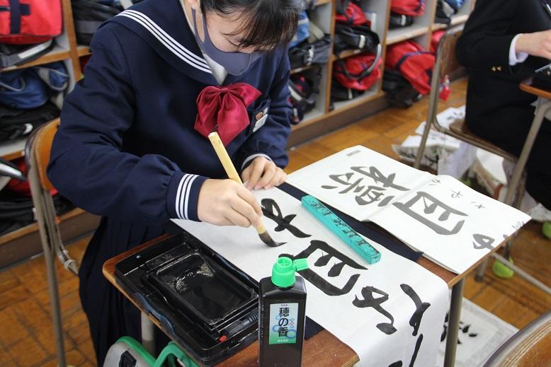 国語の時間を使って書き初めが行われました。筆先に神経を集中して書き上げていました。