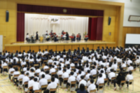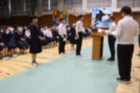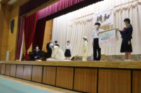 10月18日(金) 飛翔祭の2日目、オープニングは、各団のモザイクアートの披露と吹奏楽部の演奏が行われました。その後、私の主張大会・英語弁論大会の入賞者の発表そして保健委員会によるAEDの使い方の劇がありました。