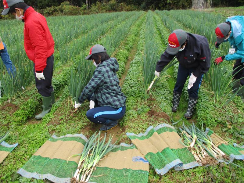 実習ではカブをコンテナに積める作業や、堆肥用のカブの切れ端を畑にまく作業、ネギの収穫を行いました。