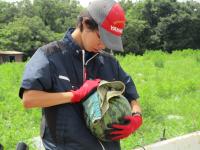 収穫したスイカを運搬機に運んだり、運ばれてきたスイカの土汚れを拭き取ったりしました。1つ1つのスイカが重く、また大変暑い中の実習でしたが、生徒たちは自分たちが4月に植えたスイカが実っているのがとても嬉しく感じたようで、一生懸命作業に取り組んでいました。