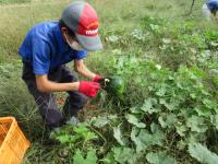 カボチャの収穫では草むらの中からカボチャを探し、大きさを選別しながら土のふき取り作業を行いました。