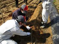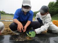 実習ではサツマイモの植え方や病気対策について説明を聞き、蔓から苗を収穫することから始めました。卒業した先輩から、苗を手植え機で植える方法について学び、植えていきました。移植機を使った苗植えについても体験させていただき、生徒たちは機械が動く様子を見て、「凄い」と声をあげていました。