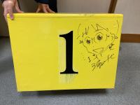 納品した台は、大会イメージカラーの黄色に塗られ、表彰式を華やかに飾りました。木工班が表彰台を製作したと知り、漫画「弱虫ペダル」原作者の渡辺航先生が、1位の表彰台に主人公のイラストとサインを描いてくださいました。
