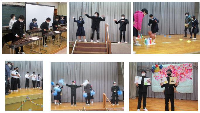 2月25日(金)高等部の卒業生を送る会がありました。3年生との最後の合奏となる音楽発表では、「音楽B:星に願いを ハンドベル演奏」から始まり「音楽A:星に願いを、スーパーカリフラジリスティックエクスピアリドーシャス、美女と野獣、小さな世界」と器楽アンサンブルを行いました。また、1年生は「ダンシング・イントロクイズ」、2年生は「ボウリング」で3年生とともに楽しみました。3年生の「ダンスショー&共同制作」では、在校生や教員へのお別れや感謝を表現し、会場を沸かせました。その後のプレゼント贈呈や記念写真撮影では涙ぐむ生徒も見られるなど、とても感動的な会になりました。