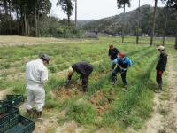 4月18日(月)、19日(火)、21日(木)、農事組合法人なたうちへ農業実習へ行きました。今回の実習ではネギの収穫、小菊カボチャ苗の定植、稲の苗箱運びを行いました。また秋に植えた玉ねぎが成長している様子や、越冬ネギ畑の見学も行いました。