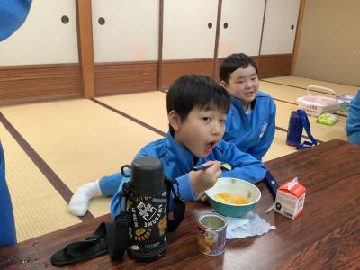 第1回目は小学部、メニューはうどんとフルーツ缶です。行儀よく座卓について友達といっしょに楽しく食べました。