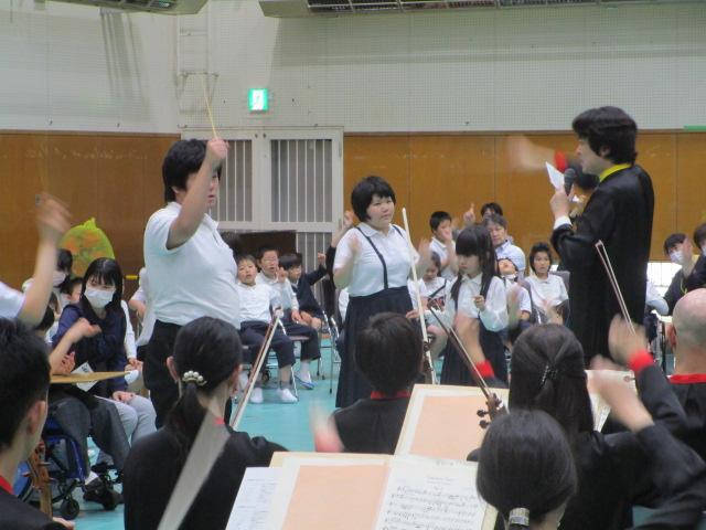 6月6日(木)オーケストラ・アンサンブル金沢による「ふれあいコンサート」が体育館で行われました。クラシックだけでなく、「さんぽ」や「YOASOBI メドレー」などの演奏や指揮者体験もあり、迫力ある生演奏に子どもたちはとても楽しんでいました。オーケストラ・アンサンブル金沢の皆様ありがとうございました。