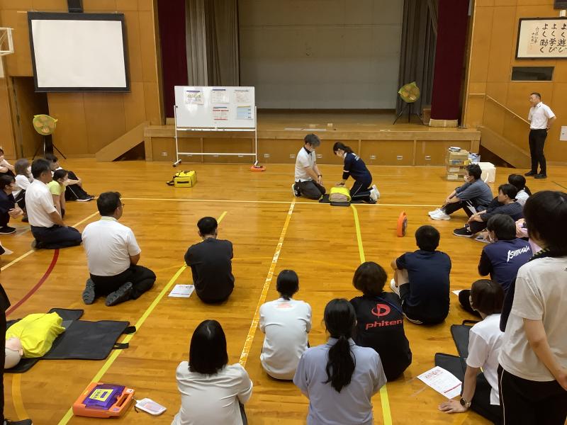 6月25日(火)に日本赤十字社石川県支部から講師を招き、教職員対象に救急法講習会を行いました。児童生徒の緊急時に備え、AEDを用いた心肺蘇生法や喉に異物が詰まった時の対処方法について実技を交えながら学びました。