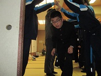 1月17日(木)に第3回避難訓練を実施しました。1995年に起きた阪神淡路大震災から24年という日でした。今回は、大型の地震により志賀原子力発電所から放射能漏れがあったことを想定し、防災頭巾をかぶり「屋内退避」しました。