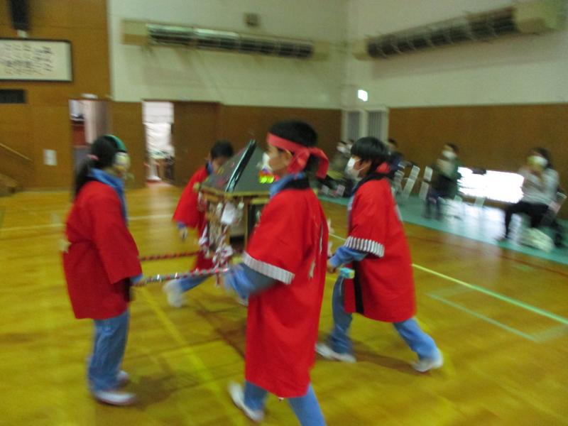 1、2年生に美術で作成したよさこいで使用する鳴子を渡し、感極まった三年生が、涙ぐむ場面がみられるなど、感動的な会になりました。