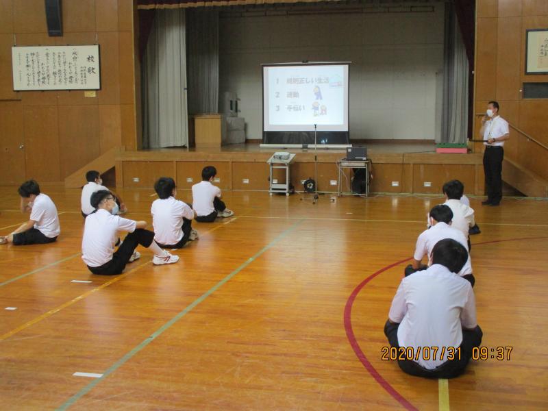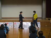 コロナウイルスの感染拡大防止に留意して、体育館をメインに各部の会場へのリモート映像で警察官の方から講話を聞きました。屋外で不審者に声をかけられた時は「いか・の・お・す・し」の行動で助けを求めて自身の身を守るようにすることなど、不審者への対応を教えていただきました。