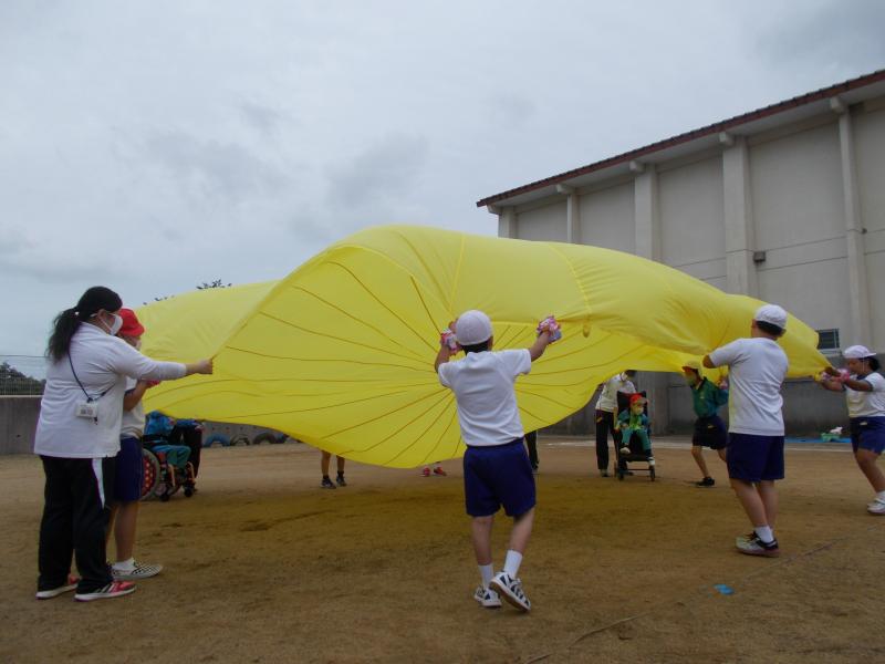はじめは、お互いに少し緊張している様子でしたが、バルーンや、くじびきゲーム、リトミックと活動がすすむにつれて、児童の緊張もほぐれ、一緒に喜んだり、笑ったりして交流することができました。