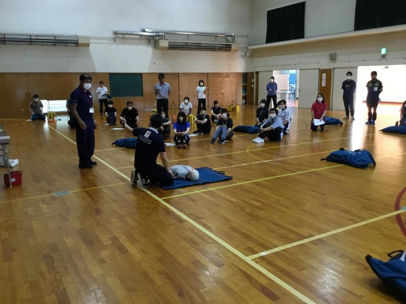 児童生徒の緊急時に備えて、教職員が救急法について学びました。日本赤十字社石川県支部の指導員の方から、傷病者の観察や心肺蘇生法、AEDを用いた除細動について講義をしていただき、その後実技演習を行いました。