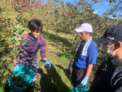 10月31日(火)と11月2日(木)に農業生産法人スギヨファームに農業実習に行きました。実習では、収穫したリンゴを出荷するまでの過程について説明を受けた後、圃場へ移動しリンゴの収穫の仕方について指導者の方が実践してくれました。リンゴに傷がついてしまうと出荷できないため、リンゴを適度な力で持ち、上方に捻るように収穫するとよいと教えてくれました。生徒たちは、リンゴを傷つけないように注意しながら丁寧に作業に取り組んでいました。また、高い位置に熟したリンゴがあった際に「あの高いところにあるリンゴはどのように収穫するんですか。」と生徒から指導者へ質問があり、指導者の方は「脚立を使用して一個一個手で収穫します。」と説明してくださいました。このように生徒たちは、関心をもって作業に取り組む姿がうかがえました。さらに、指導者の方からは、「丁寧に作業に取り組んでおり、大変良い」と評価をいただきました。