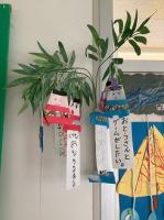 7月7日(水)七夕の日。校内の廊下の七夕飾りのいくつかを紹介します。みんなの願い事をまとめた大きい笹飾りから、かわいらしい飾りまで、いろいろです。「修学旅行に行けますように」とか「実習で仕事ができますように」や、「お金持ちになって有名になりたい」「おもちゃが欲しい」などなど、願い事もいろいろです。願い事が叶いますように!