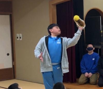 1月26日(金)小学部の始業式がありました。始業式には、大谷翔平選手から届いた3つのグローブが紹介されました。代表で6年生の男子児童2名が教員と一緒にキャッチボールをしました。2人とも上手にグローブでボールをキャッチすることができて喜んでいました。他の児童も応援しながら楽しそうにキャッチボールを見ていました。児童たちの笑顔があふれる素敵な新学期のスタートとなりました。