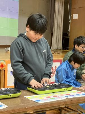 2月26日(月)に小学部の「卒業生おめでとう会」がありました。低学年は『シンコペーテッド・クロック』と『ピコピコパン』の音楽発表、中学年は『パズルゲームと』と『オー・シャンゼリゼ』の合奏、5年生は、『○×ゲーム』の出し物をしました。6年生からは卒業制作で作った『フラワーベンチ』の贈呈がありました。在校生からのプレゼント渡しでは、少し照れながらも6年生へ感謝の気持ちを込めて渡す姿が見られました。小学部6年生にとっても在校生にとっても思い出に残る楽しい会となりました。