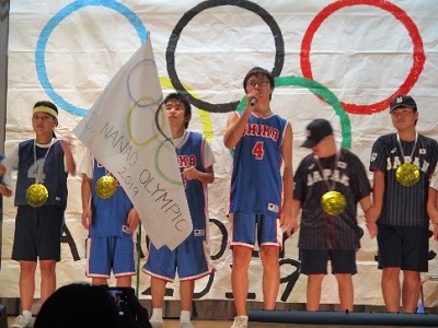1、2年生に美術で作成したよさこいで使用する鳴子を渡し、感極まった三年生が、涙ぐむ場面がみられるなど、感動的な会になりました。