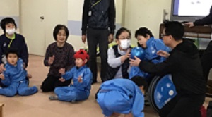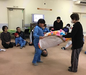 はじめは、お互いに少し緊張している様子でしたが、バルーンや、くじびきゲーム、リトミックと活動がすすむにつれて、児童の緊張もほぐれ、一緒に喜んだり、笑ったりして交流することができました。
