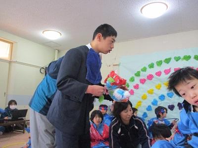 1年生は、プレゼントを3年生一人一人に渡した後、「さよなら大好きな人」を合奏しました。2年生は、クイズや手品で会場を盛り上げた後、「さくら」を歌い3年生に感謝の気持ちを伝えました。3年生は感謝の気持ちを述べた後、中学部で成長したことを一人一人発表して、高等部での決意を新たにしました。