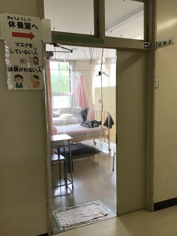 ・体調不良者の対応をする部屋の入り口やベッドの周りは、ビニールカーテンで仕切りをしています。