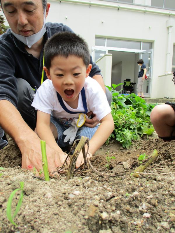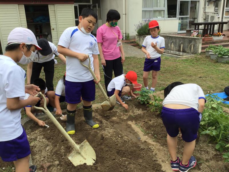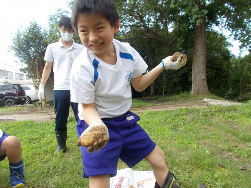 7月 今年は雨模様の日が多く、みんなのジャガイモはどれだけ大きくなったか、少し心配でした。各学年で収穫したところ、心配も何のその!きれいな形のジャガイモがゴロゴロ、ごろごろ。残念ながら、コロナウイルス感染予防のため、学校内で調理学習をすることができませんでしたが、お家でジャガイモは何に変身しましたか?コロッケ?カレーライス?ポテトサラダ?  お味は?