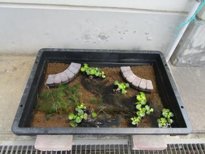 保健室の窓の下のビオトープ、高等部1年2組の水槽で、元気に泳いでいます。